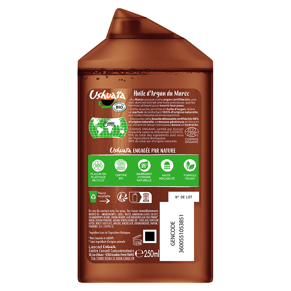 Inspirée par ce secret de beauté ancestral, la Recherche Ushuaïa a créé un gel douche Délassant à l’Huile d'Argan du Maroc, certifié BIO par ECOCERT avec 98% d’ingrédients d’origine naturelle.