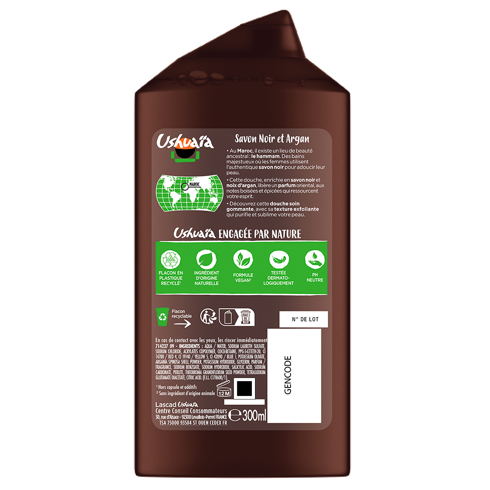 - Douche Soin Gommante Hammam adoucissante Ushuaïa, au Savon Noir & éclats de noix d'Argan :