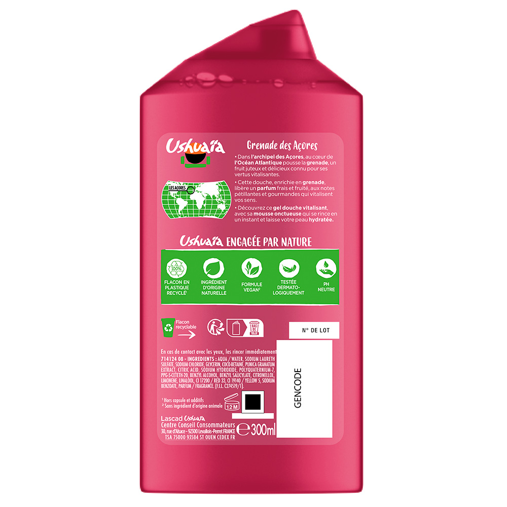 En cas de contact avec les yeux, les rincer immédiatement et abondamment. Ne pas laisser à la portée des enfants sans surveillance. Ne pas avaler - 800249 02 - INGREDIENTS: AQUA / WATER • AMMONIUM LAURYL SULFATE • COCAMIDOPROPYL BETAINE • SODIUM CHLORIDE • ALOE BARBADENSIS LEAF JUICE POWDER • INULIN • PUNICA GRANATUM PERICARP EXTRACT • SODIUM HYDROXIDE • CITRIC ACID • GLYCERIN • PENTYLENE GLYCOL • LIMONENE • LINALOOL • BENZOIC ACID • SODIUM BENZOATE • PARFUM / FRAGRANCE (F.I.L. Z70024329/1). Les listes d’ingrédients entrant dans la composition des produits de notre marque sont régulièrement mises à jour. Avant d’utiliser un produit de notre marque, vous êtes invités à lire la liste d’ingrédients figurant sur son emballage afin de vous assurer que les ingrédients sont adaptés à votre utilisation personnelle